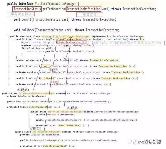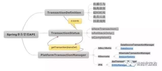 提供控制事务执行和查询事务状态的方法。Spring事务管理主要API结构如下: