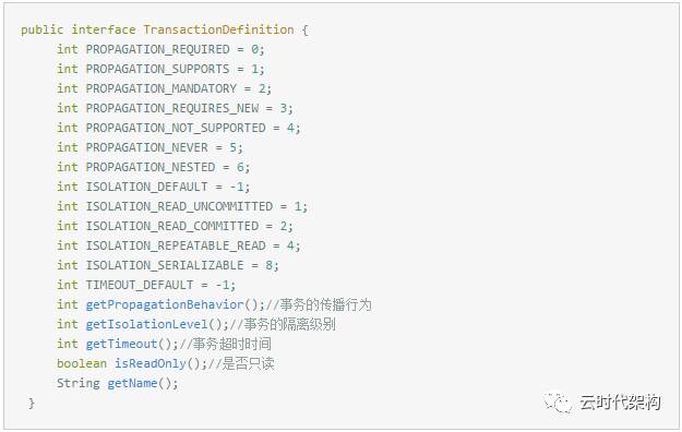 接口是用于定义一个事务,它定义了Spring事务管理的五大属性,在上一篇文章中有详细介绍。Spring提供了一个该接口的默认实现
