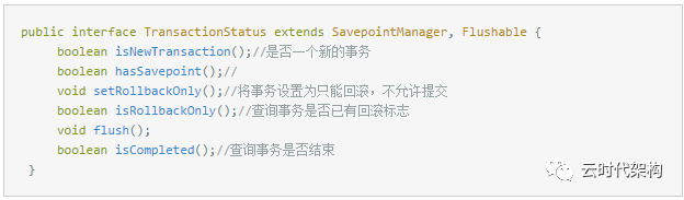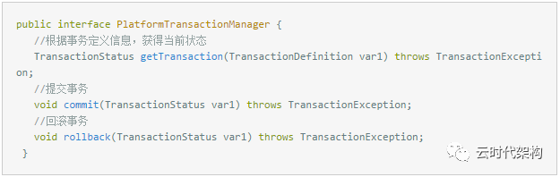 接口代表了一个事务本身,提供了一个简单的控制事务执行和查询事务状态的方法。PlatformTransactionManager