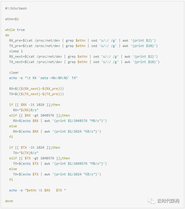 脚本是通过读取运行时文件系统/proc/net/dev中的网络实时数据,并通过简单计算得到的。关于目录/proc/net/dev,请参考下文。