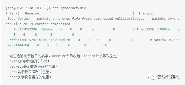 Linux 内核提供了一种通过 proc 文件系统,在运行时访问内核内部数据结构、改变内核设置的机制。proc文件系统是一个伪文件系统,它只存在内存当中,而不占用外存空间。它以文件系统的方式为访问系统内核数据的操作提供接口。用户和应用程序可以通过proc得到系统的信息,并可以改变内核的某些参数。由于系统的信息,如进程,是动态改变的,所以用户或应用程序读取proc文件时,proc文件系统是动态从系统内核读出所需信息并提交的。/proc文件系统中包含了很多目录,其中/proc/net/dev 保存了网络适配器及统计信息。