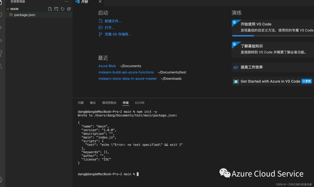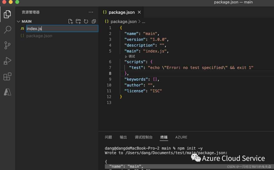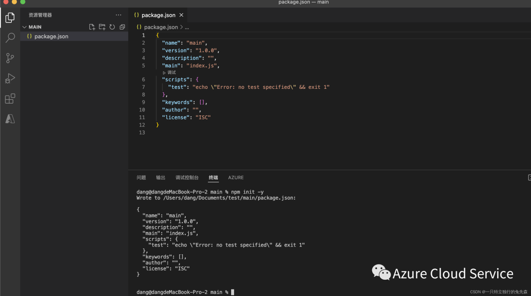 2.初始化完毕以后,如下图所示,会生成一个名为“package.json"的文件