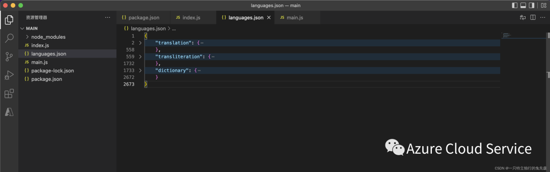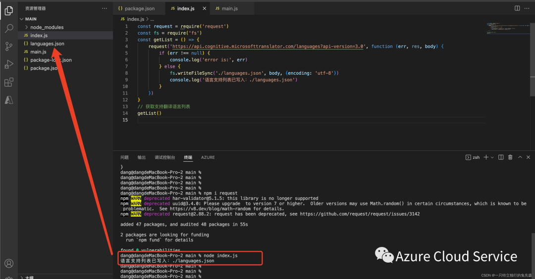 3.调用代码编写完毕后,我们使用node index.js 执行获取Azure Cognitive Services Translator所支持的翻译语言列表,执行完毕以后,我们可以在"languages.json"中看到具体支持的翻译语言列表