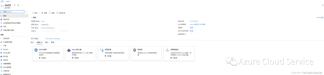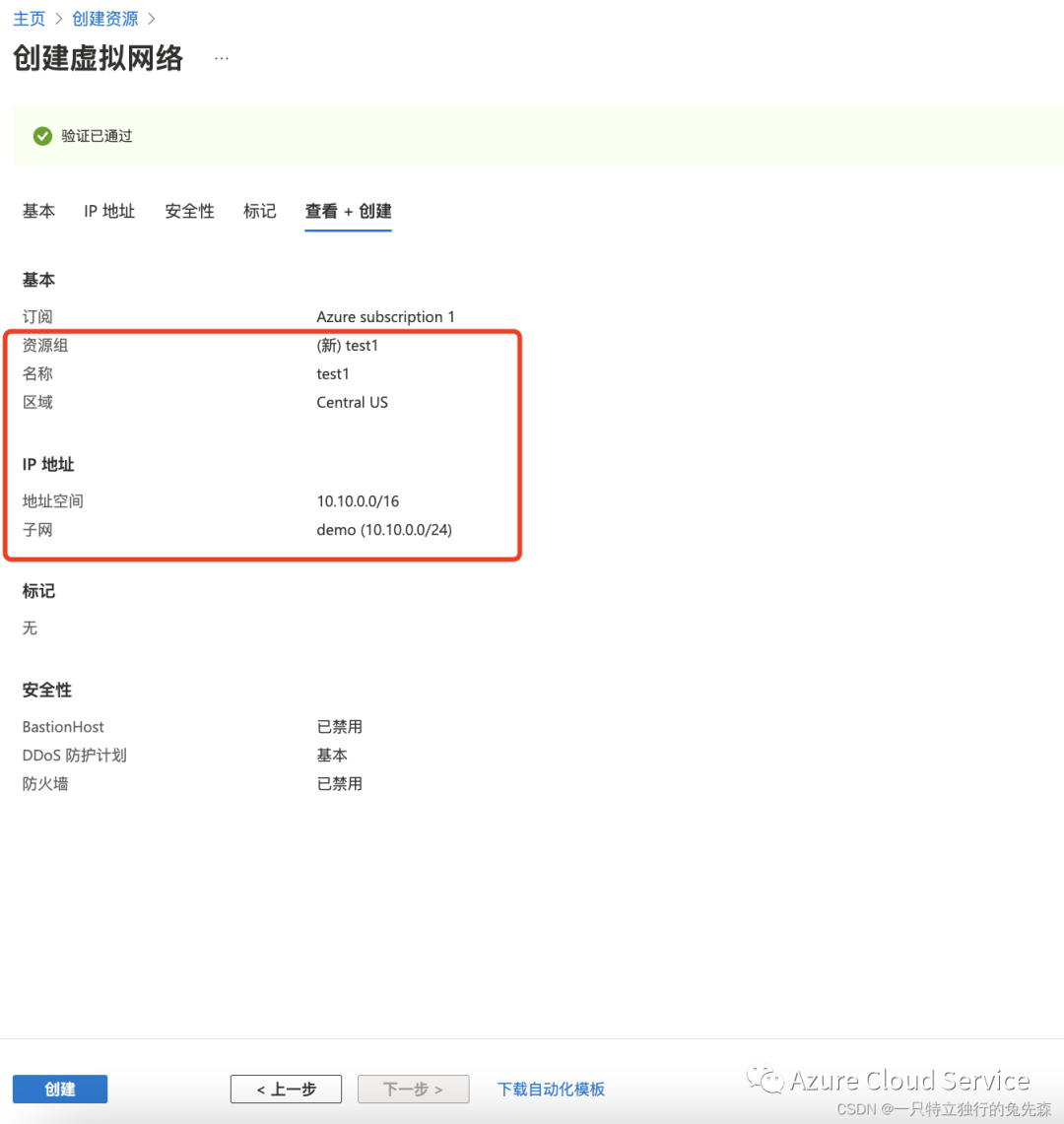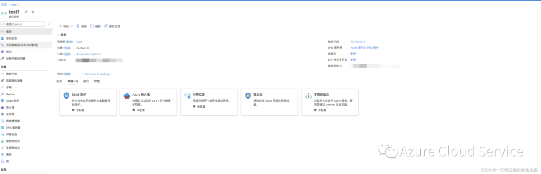 1.创建一个名为test1,地址空间为10.10.0.0/16,子网为10.10.0.0/24的虚拟网络