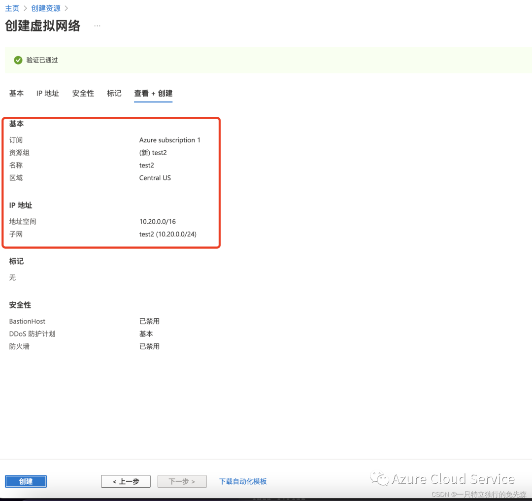 2.创建一个名为test2,地址空间为10.20.0.0/16,子网为10.20.0.0/24的虚拟网络