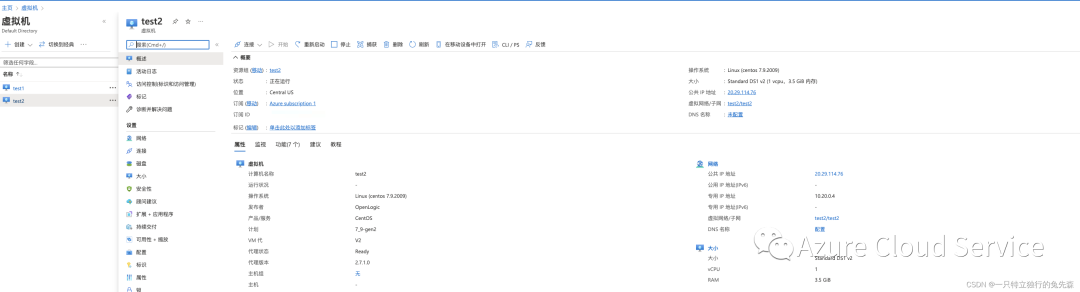 2.在网络接口配置中,虚拟网络配置为我们创建的虚拟网络“test2”,子网配置为我们在虚拟网络中的配置的子网信息