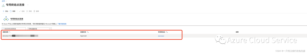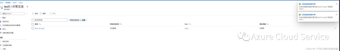 3.我们添加完虚拟网络配置对等互连后,我们点击“刷新”按钮,就可以看到对等连接状态将从“正在更新”更改为“已连接”。