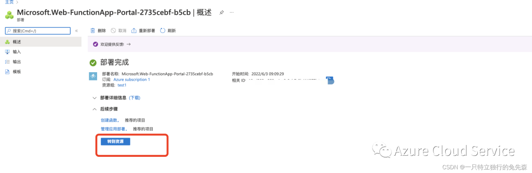 3.函数应用创建完毕后,如下图所示,我们点击“转到资源”