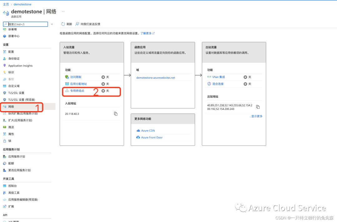 1.在函数应用——设置——网络中配置函数应用专用终结点,我们点击进入“函数应用专用终结点”