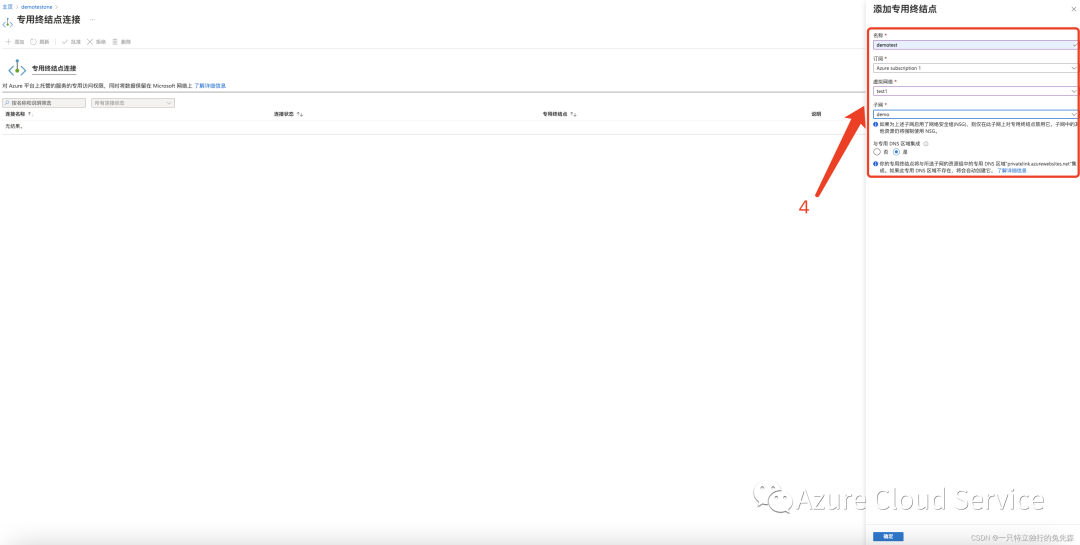 3.在添加专用终结点中,我们选择要将其终结点所在的虚拟网络以及子网,同时在与专用DNS区域集成中,我们选择“是” 并点击确定