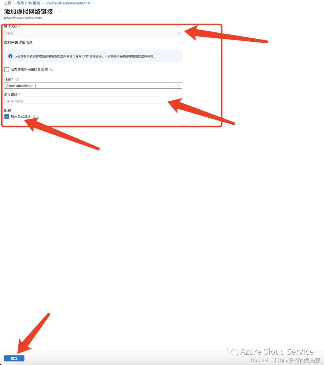 3.将我们创建的虚拟网络test2和专用DNS区域绑定在一起,同时启用“自动注册”功能 ,配置好以后,我们点击“确定”完成互连绑定