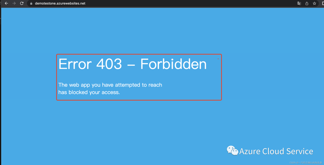 1.为了验证函数应用只能在内网虚拟网络中进行访问,我们函数应用的域名地址复制到我们本地的电脑上面,我们在我们本地的电脑浏览器上进行访问,如下图所示,我们发现访问函数应用的域名地址以后,会出现“Error 403 -Forbidden"的错误
