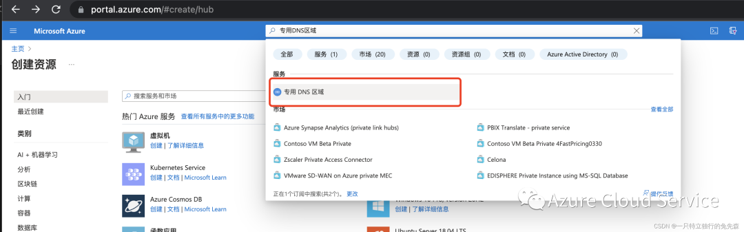 1.在门户搜索栏中的文本框中输入专用DNS区域,然后点击进去