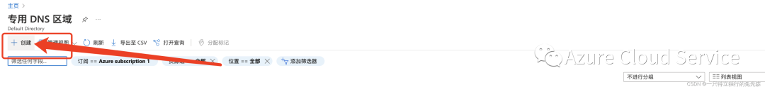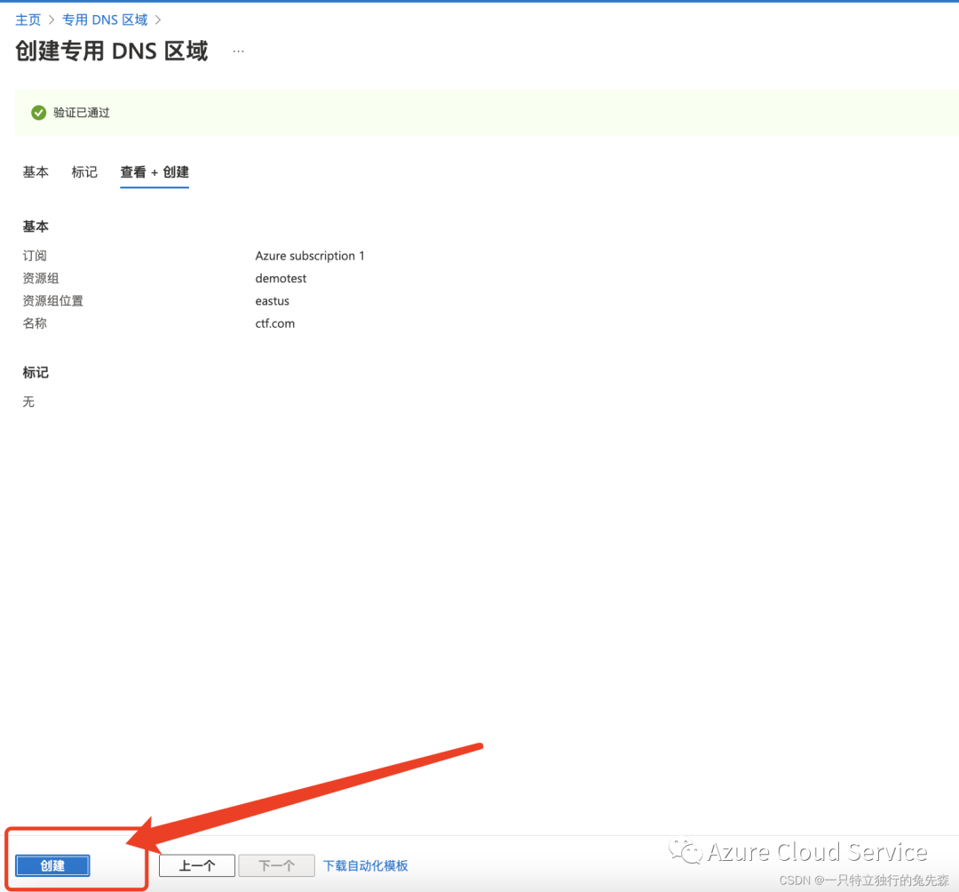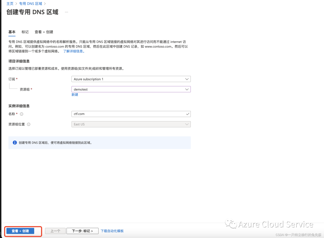 3.按照下图所示 创建专用DNS区域,选择配置完毕以后,点击“查看+创建”