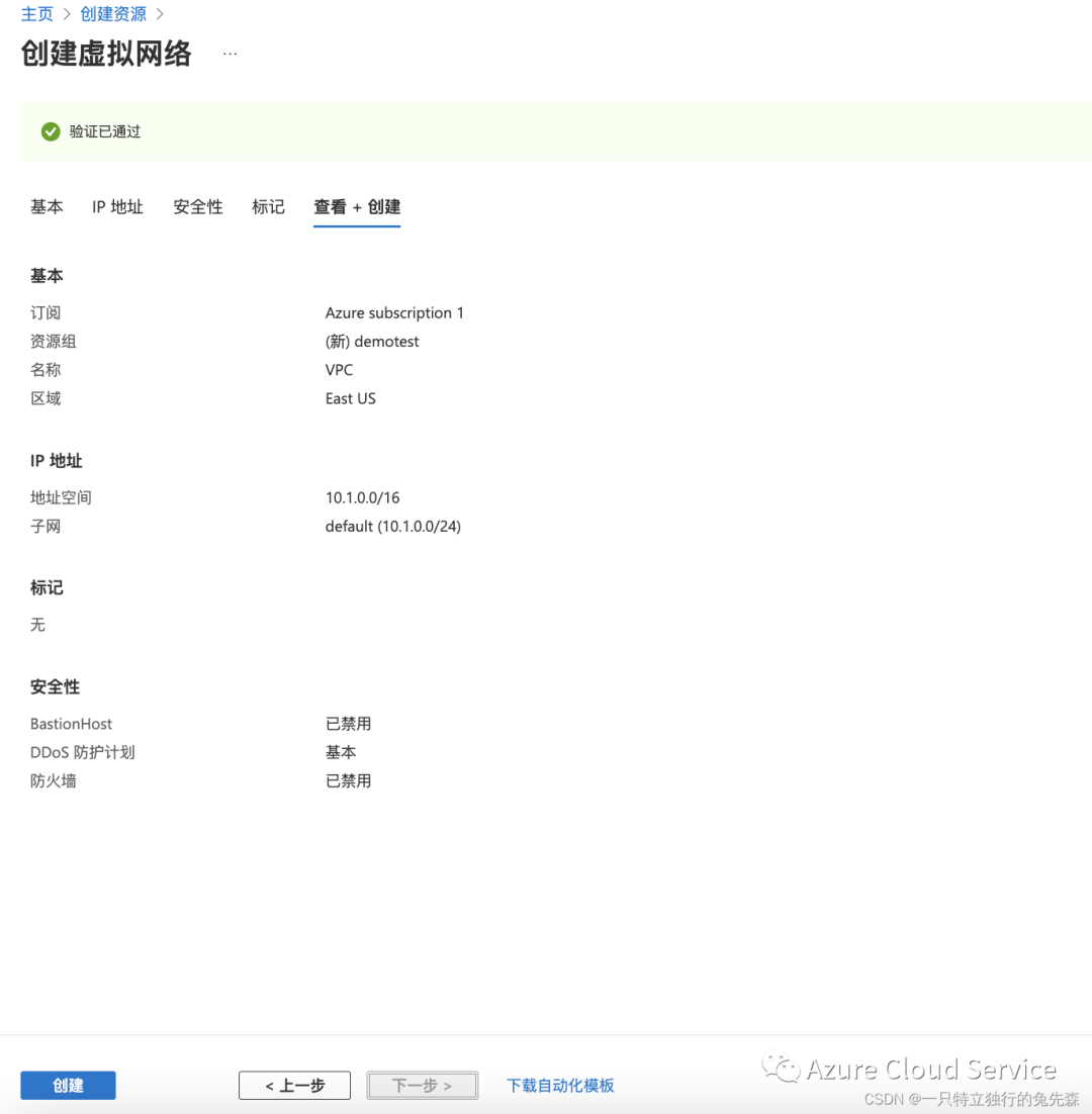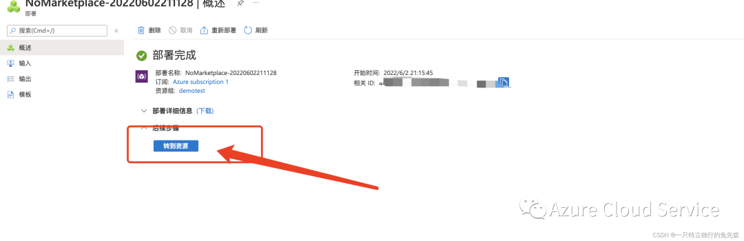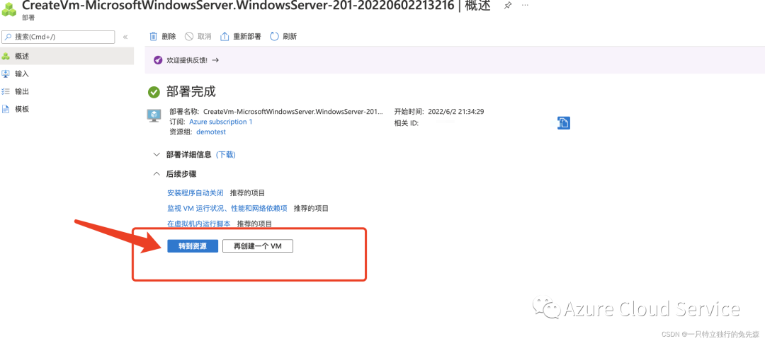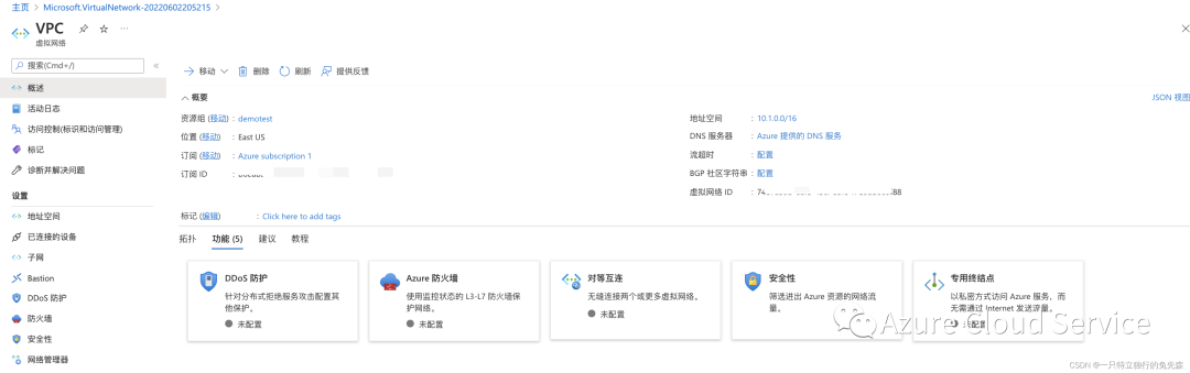 7.Virtual network 虚拟网络部署完成,我们点击“转到资源”即可查看我们已创建的Virtual network
