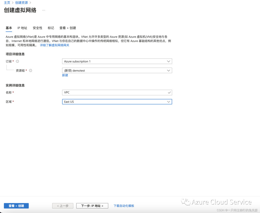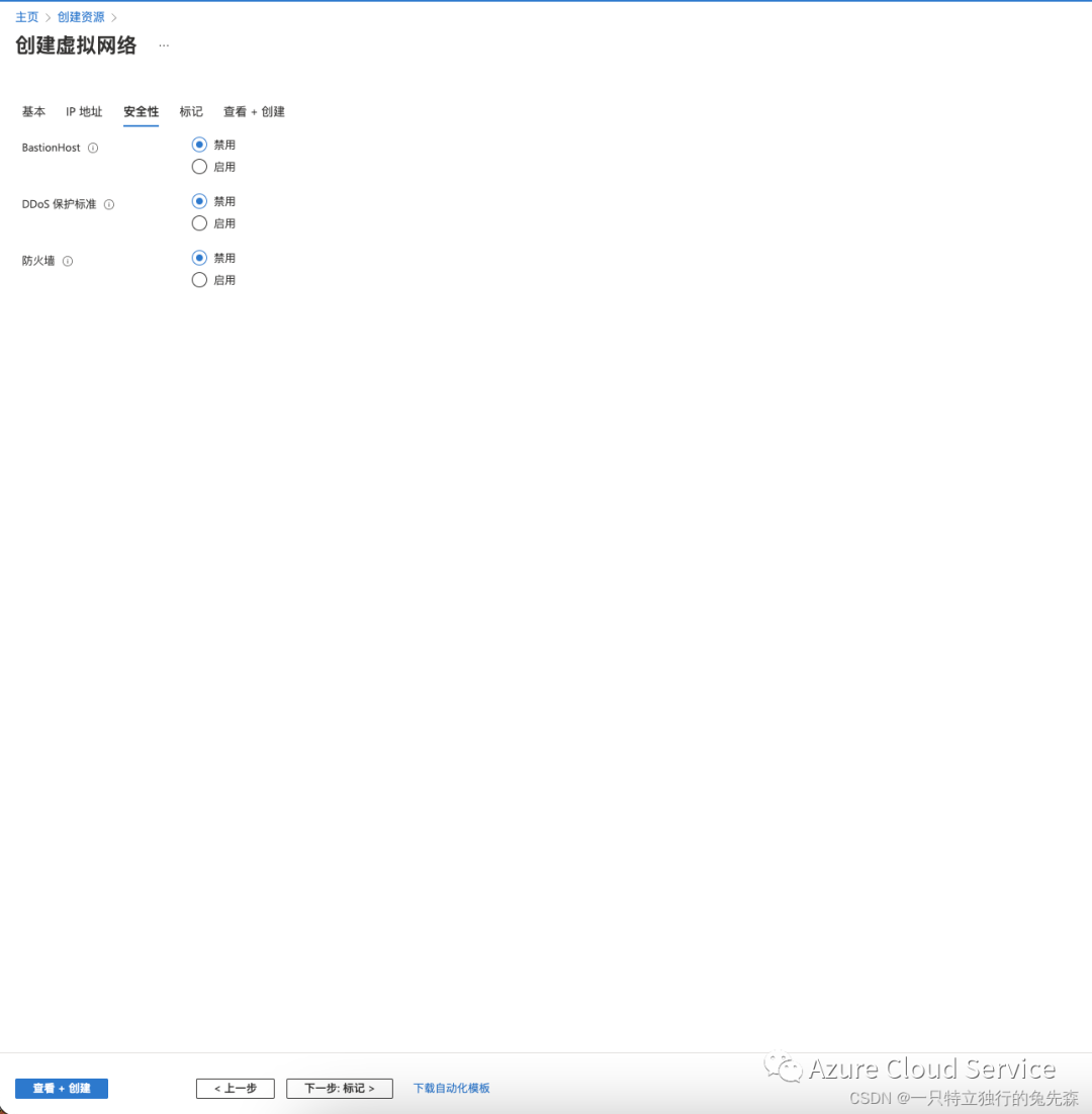 5.在虚拟网络的安全性配置这块,我们选择默认的配置,并点击下一步操作