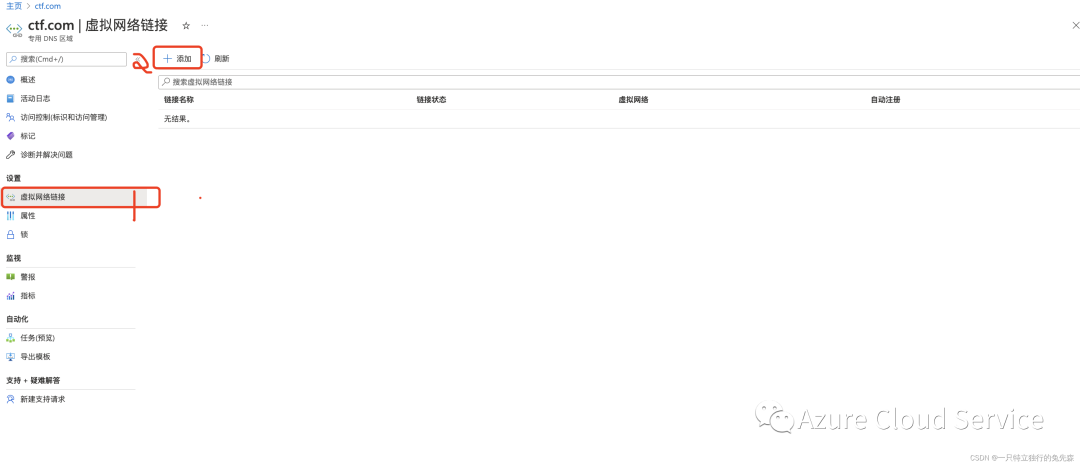 1.在专用DNS区域中,点击设置——虚拟网络链接——添加