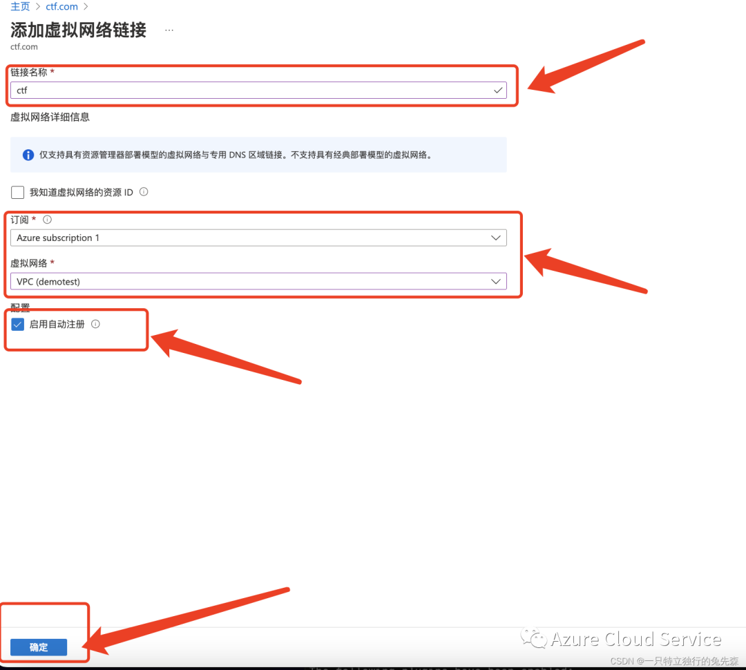 2.根据实际场景配置“链接名称”、选择订阅以及要关联的虚拟网络,并启用自动注册