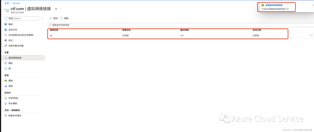 3.配置完毕以后,会提示我们虚拟网络链接创建完毕,届时我们完成了将专用DNS区域连接到Vnet虚拟网络操作