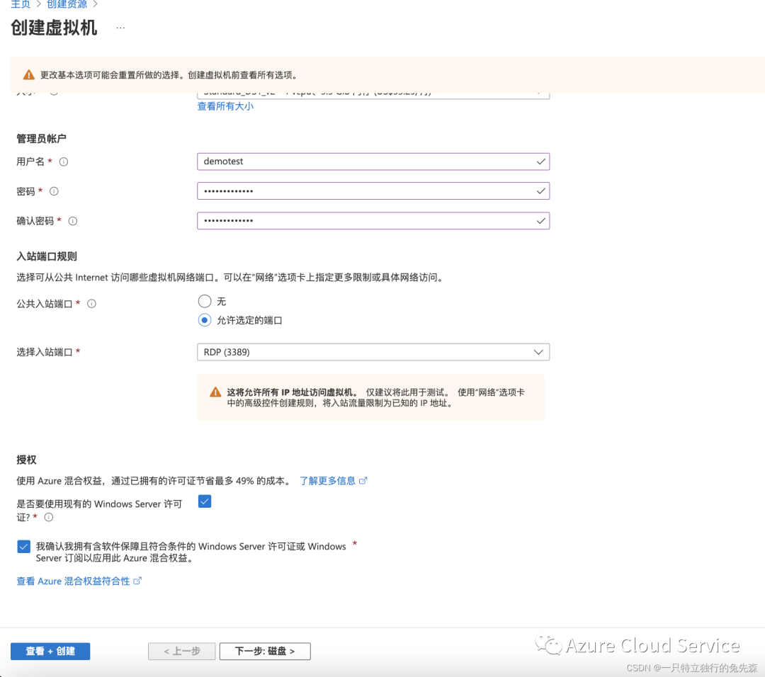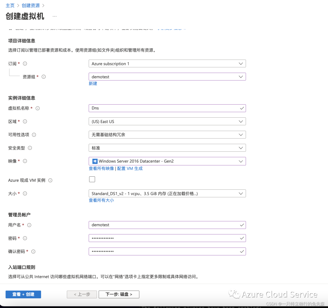 1.配置基本的Azure VM信息(包括订阅、资源组、实例详细信息,管理员账号及入站端口规则),具体配置如下所示:
