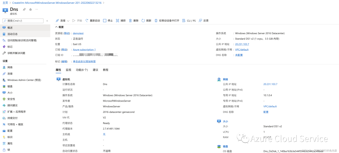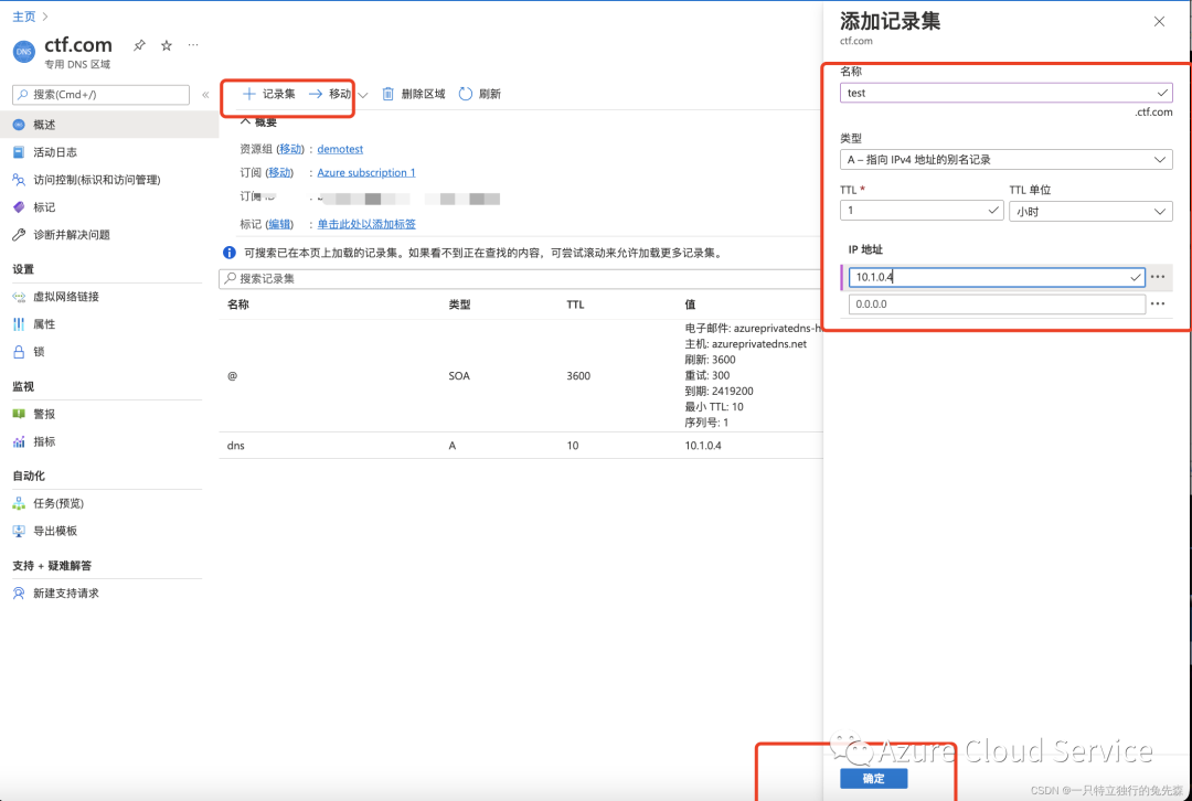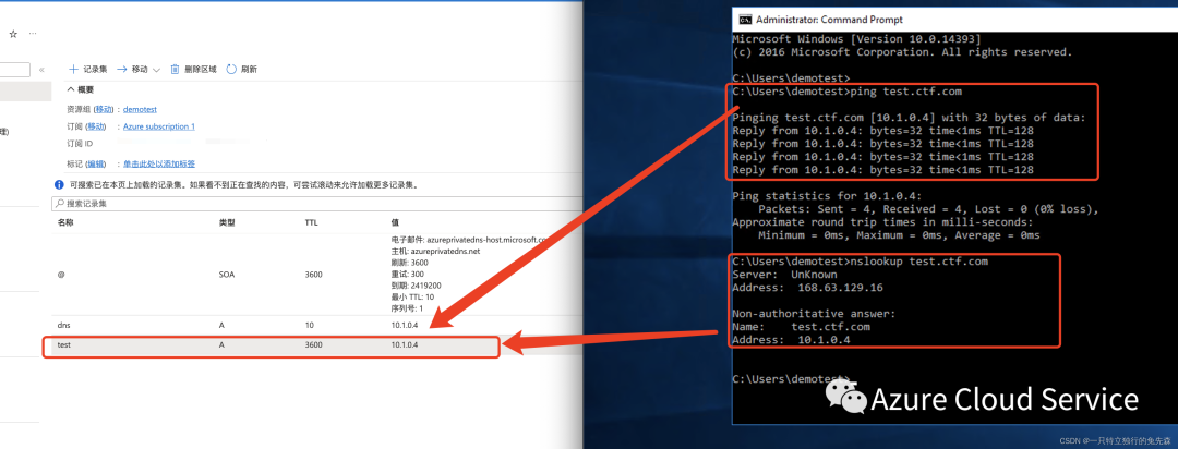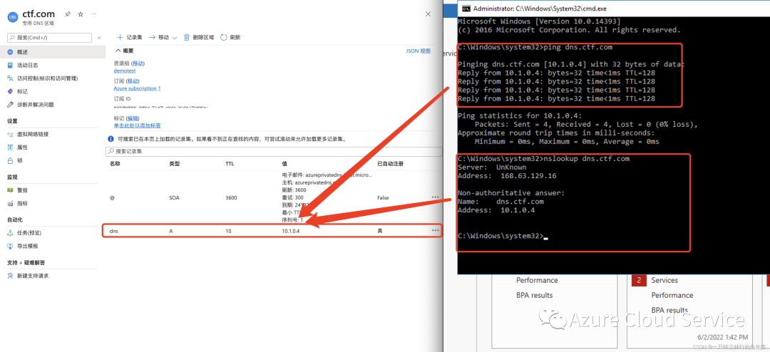 1.我们返回到专用DNS区域,即可看到新增加了一条名称为DNS、解析类型为A记录、解析记录值为:10.1.0.4的内部域名解析,我们在创建Azure VM中分别使用ping以及Nslookup命令对域名解析进行验证,具体如下图所示
