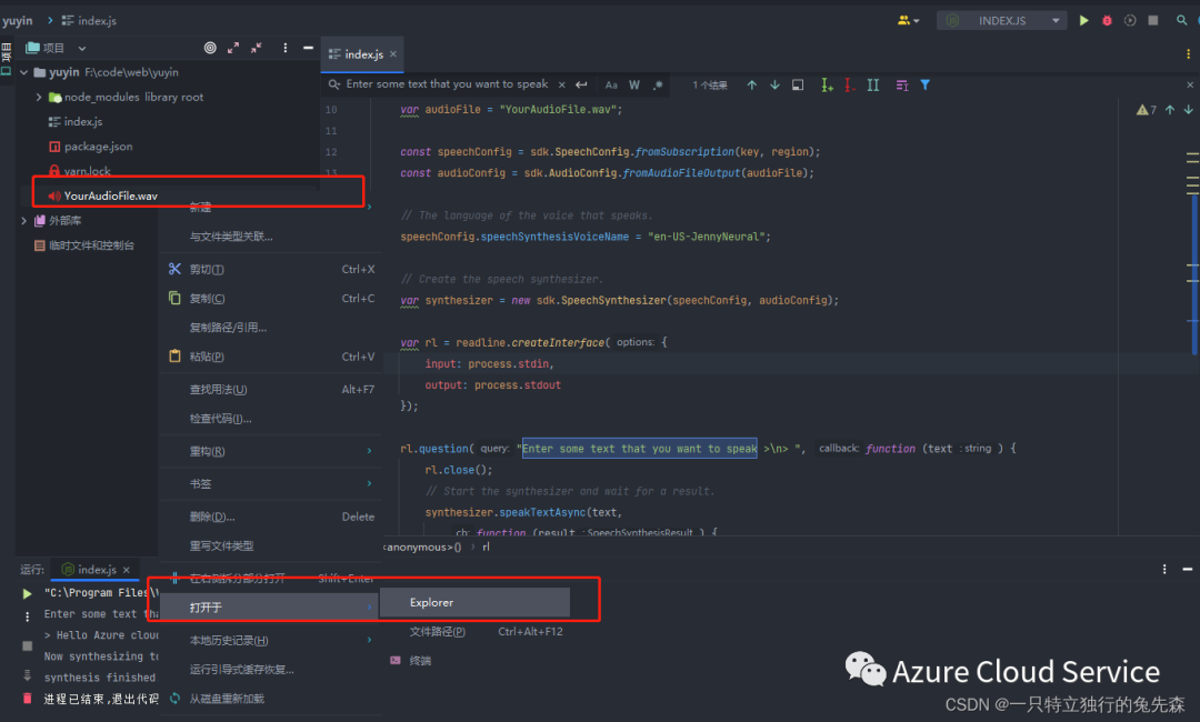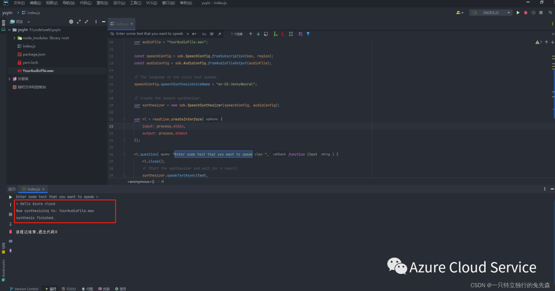 1.在Vscode终端中,执行node程序,开始将语音合成到文件: