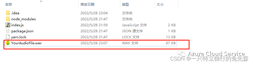 2.并在index.js 中,将 YourSubscriptionKey 替换为语音资源密钥,将 YourServiceRegion 替换为语音资源区域。