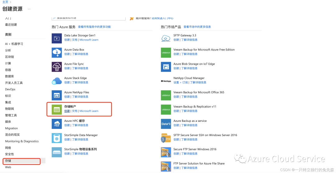 1.在Azure市场的“存储”中,选择“存储账户”并点击创建
