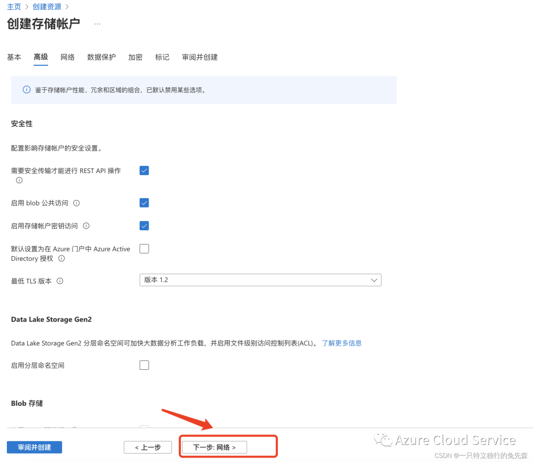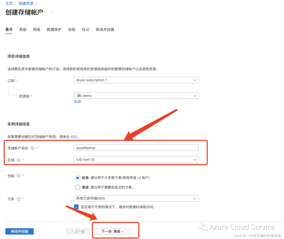 2.配置Azure Blob Storage 为 “azurefileshar” ,配置完毕以后,我们点击:下一步:高级>