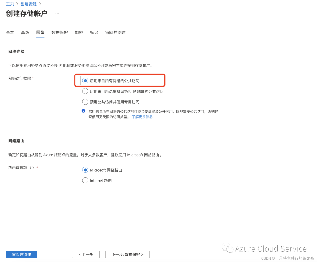 4.在“网络”配置中,选择“启用来自所选有网络的公共访问” 配置完毕以后,点击“审阅并创建”