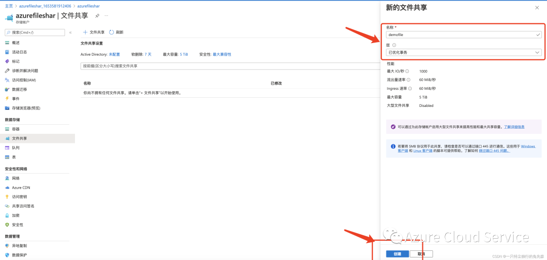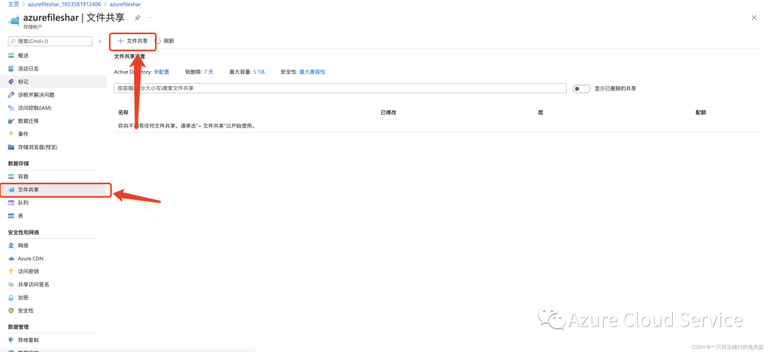 2.如果没有新的共享,可以对其新建一个Azure存储文件共享