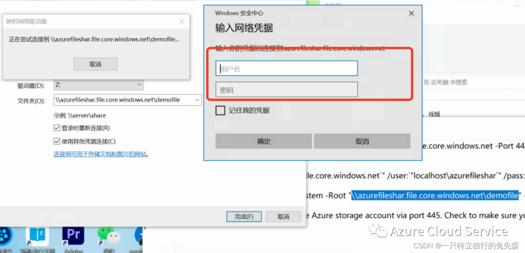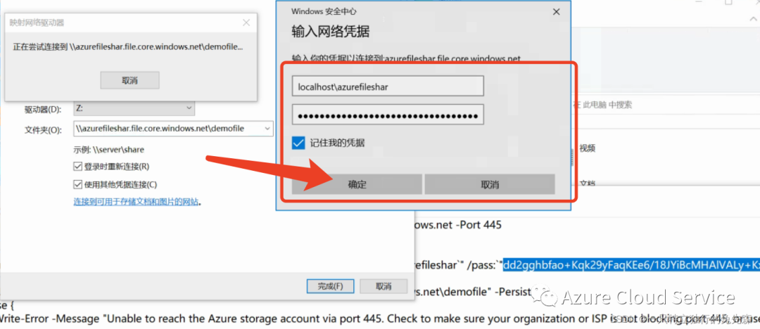 5.输入完 Azure 文件共享的账户密码后,点击“确定”按钮 进行连接