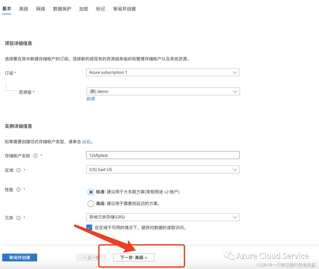 2.配置Azure Blob Storage 为 “12sftptest” ,配置完毕以后,我们点击:下一步:高级>