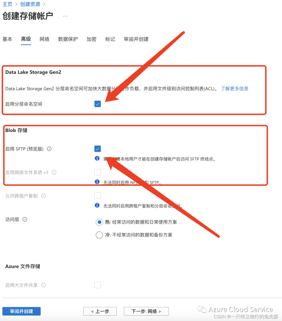 3.在高级——Data Lake Storage Gen2中选中“启用分层命名空间”及“启用SFTP(预览版)"