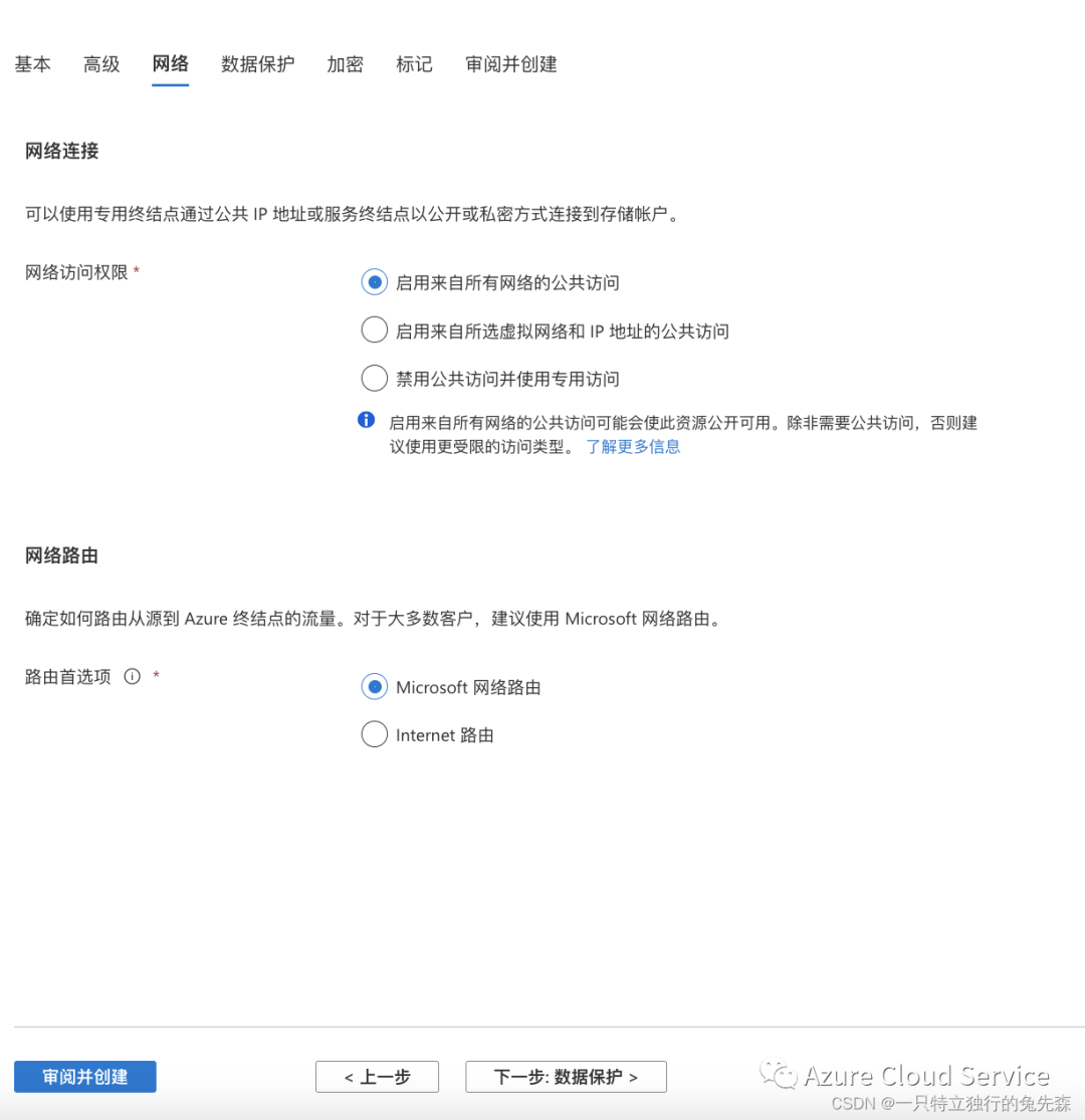 4.在“网络”配置中,选择“启用来自所有网络的公共访问” 配置完毕以后,点击“审阅并创建”
