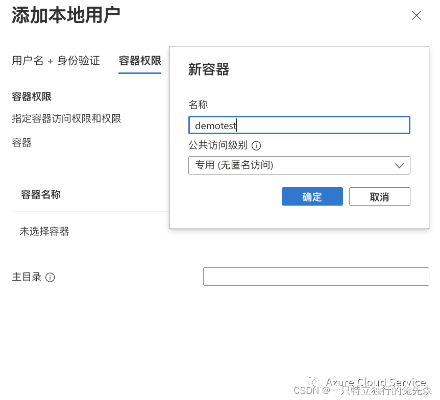 4.创建容器命名为“demotest” 并设置其容器权限为全部(包含:读取、写入、列表、删除、创建“)
