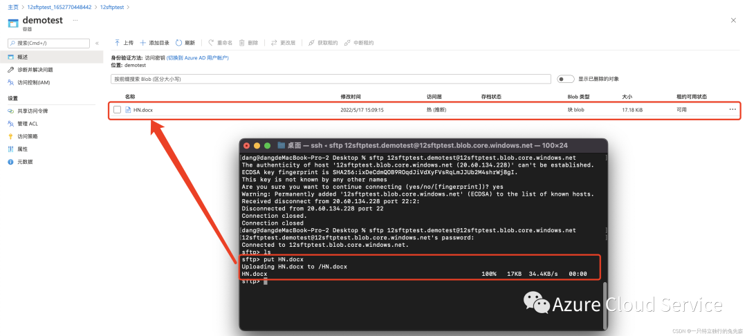 4.如下图所示,我们进入到Blob存储账户中,我们点击容器发现,我们已经通过SFTP客户端将我们本地的文件上传到我们创建的Azure Blob 存储服务里了