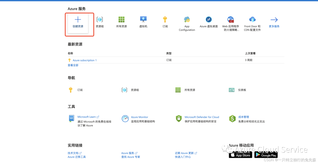 1.使用 Azure 帐户凭据登录到 Azure 门户。在 Azure 主页上,选择“创建资源”。