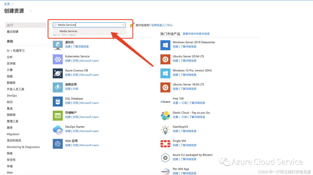 2.在“Azure 市场”菜单上,搜索“Media Service”