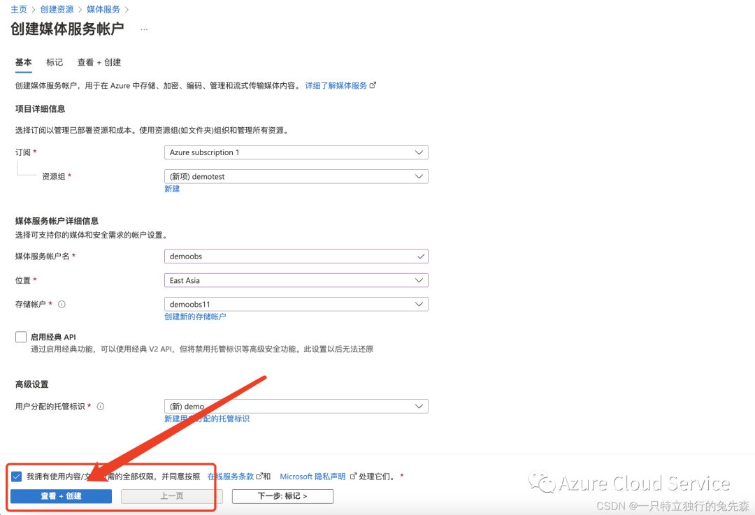 订阅:Azure 订阅名称。本示例使用“Azure subscription 1 ” 资源组:用于组织相关资源的 Azure 资源组的名称。此示例创建一个名为“demotest”的新资源组。