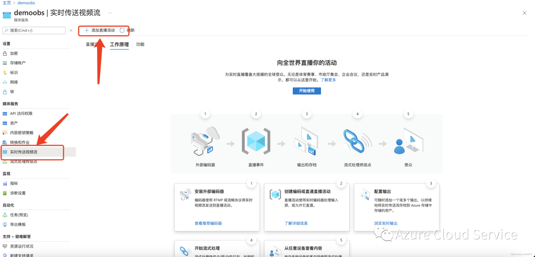 1.我们点击媒体服务——实时传送视频流——添加直播活动