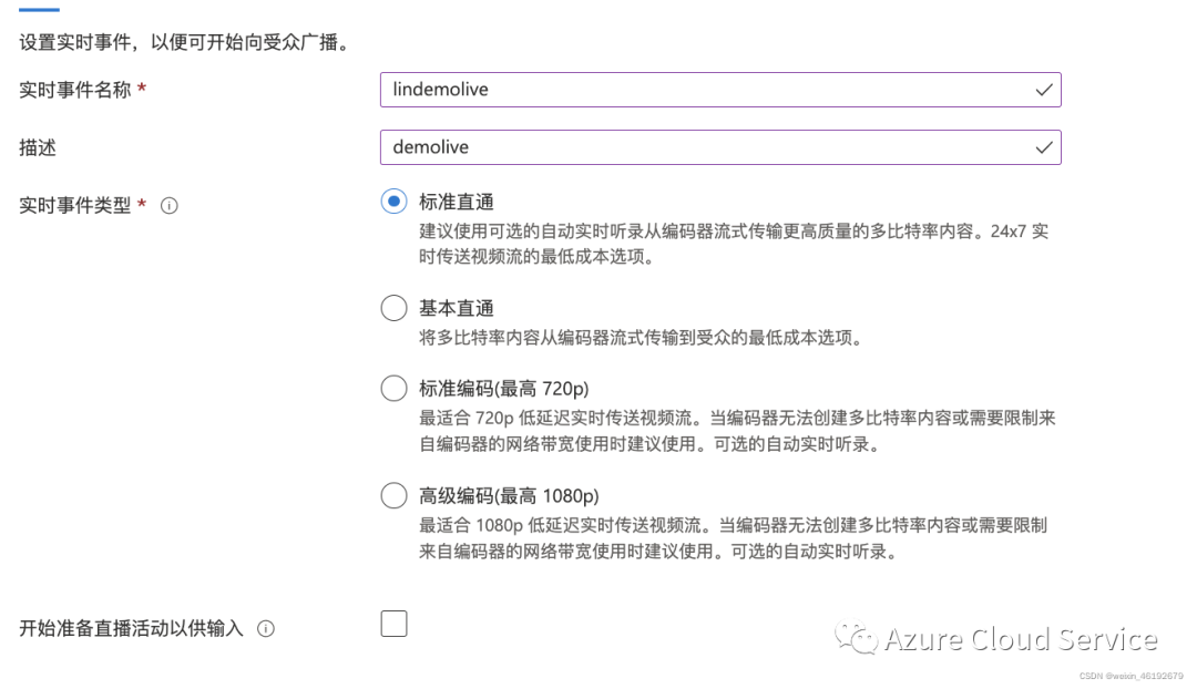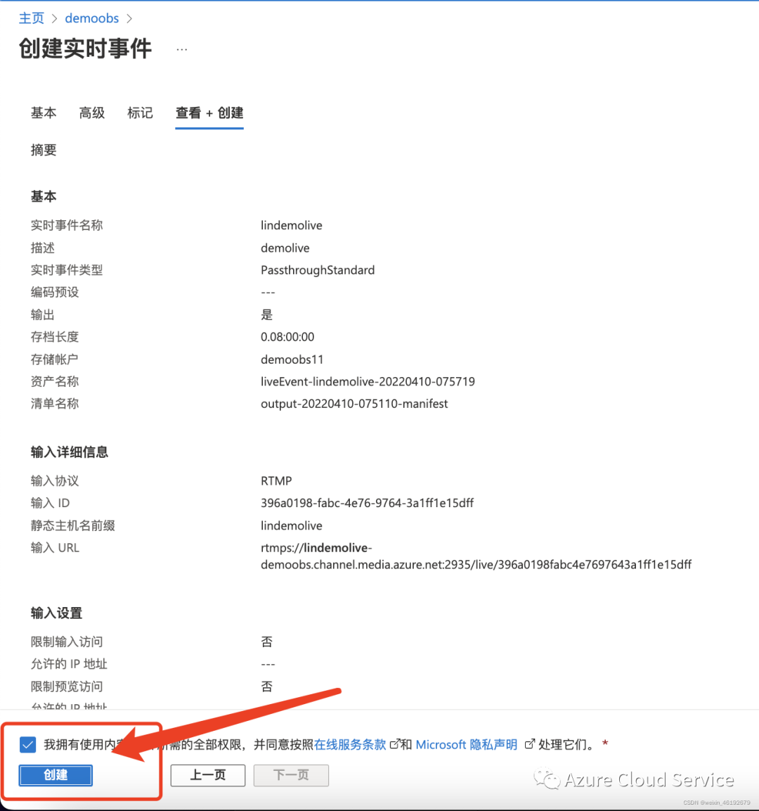 媒体服务账户名:配置媒体服务的具体账户名 位置:媒体服务的具体位置信息 存储账户:用于存储直播的存储账户