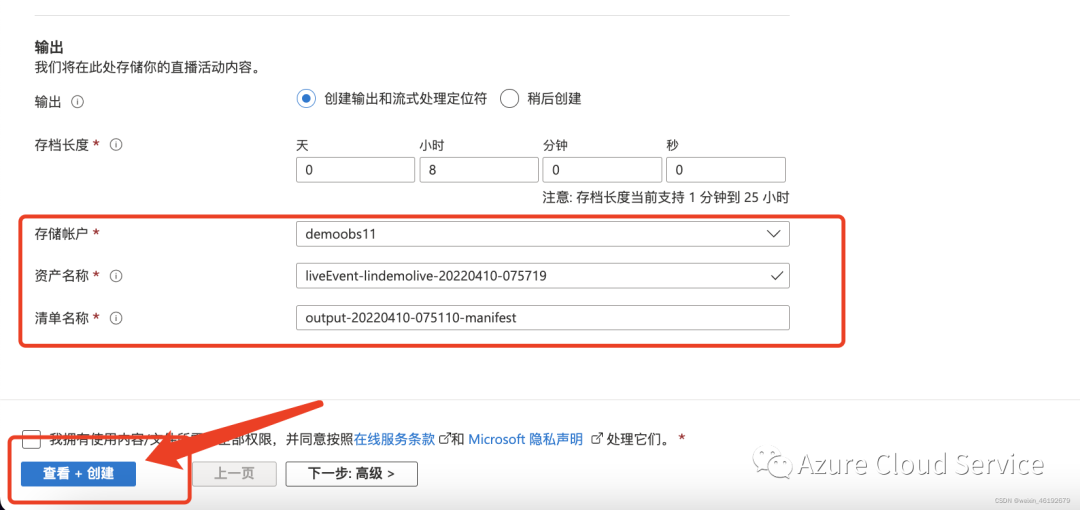 4.在输出配置方面,配置好相关输出的路径、存储账户、资产名称等,配置完毕后,点点击”查看+创建“完成配置