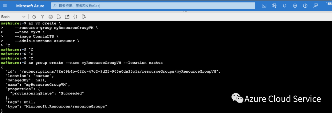 ①Azure 资源组是在其中部署和管理 Azure 资源的逻辑容器。必须在创建虚拟机前创建资源组,通过如下命令执行创建名为myResourceGroupVM的资源组