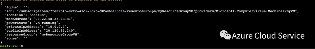 {"fqdns": "","id": "/subscriptions/d5b9d4b7-6fc1-0000-0000-000000000000/resourceGroups/myResourceGroupVM/providers/Microsoft.Compute/virtualMachines/myVM","location": "eastus","macAddress": "00-22-48-27-2B-E1","powerState": "VM running","privateIpAddress": "10.0.0.4","publicIpAddress": "20.120.95.240","resourceGroup": "myResourceGroupVM"}