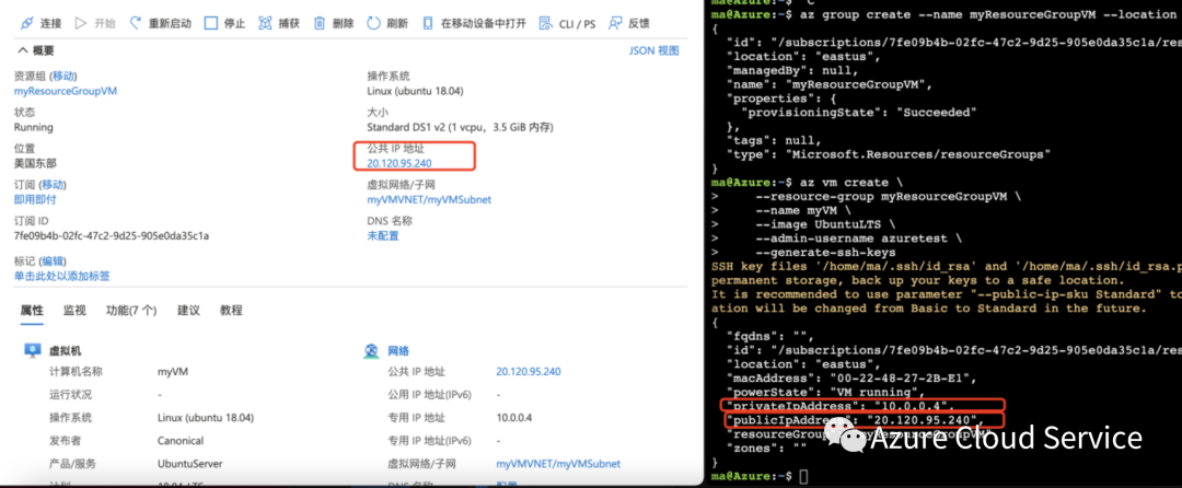① 我们通过控制台或者Azure Cloud Shell返回的信息获取到了远程公网IP地址,IP地址如下图圈中所示