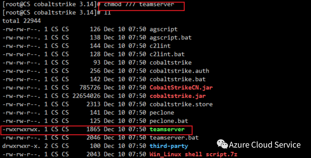 手动切换到CS安装包的路径下,执行如下命令赋予权限Chmod 777 teamserver