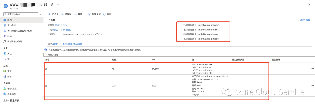 点击查看新创建的DNS 实例详情,我们可以看出,Azure DNS 自动在我们的区域中为所分配的名称服务器创建权威 NS 记录。