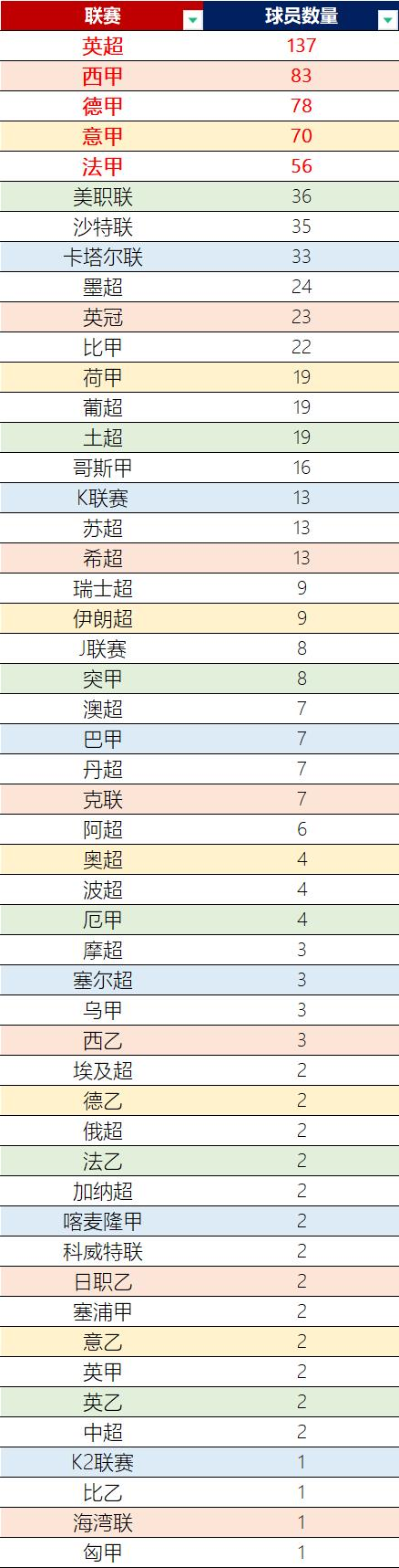 而来自中超球队的外援参加世界杯的人数,有了大幅降低,本届世界杯,只有2名球员来自中超联赛,分别是山东鲁能的孙准浩和上海申花的巴索戈,从下面这张图,可以看到,五大联赛的优势很明显,而且顺次就可以展示出各大联赛的吸引力,值得一提的是,沙特国家对所有的球员都来自本国联赛,