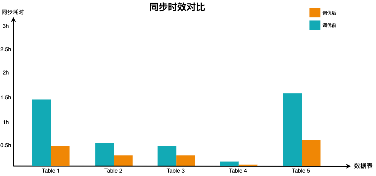 首先可以通过适当调高 FE 的max_broker_concurrency去提高 Scan HDFS 文件阶段的并发度(最高调高至 BE 节点数),而对于 Table Sink 阶段,可通过调高 FE 的default_load_parallelism(设置fe.conf,可调整到 BE 节点数)和 send_batch_parallelism参数( SQL Session 执行set global send_batch_parallelism=5或在提交 Broker Load 中的 PROPERTIES 中指定,最高调整到 5,如果超过此值,需要同步调整 be.conf的 max_send_batch_parallelism_per_job 参数),提高该阶段并发度。通过提高 Broker Load Job 各阶段导入的并发度,相关报表的同步时效显著提升,这里我们选取 5 张典型表为例,优化前后的同步时效表现如下: